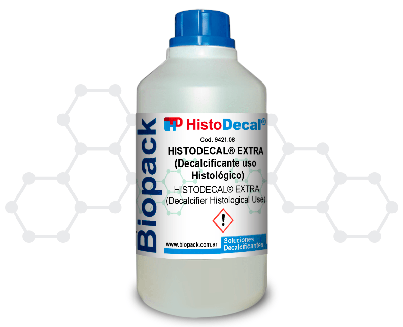 Solución descalcificante de uso histológico, de acción quelante a base de EDTA con pH 7, y libre de ácidos fuertes u orgánicos. Aplicación general para piezas de tejido óseo completas, semicompletas o biopsias que requieran máxima preservación de detalles celulares y adecuada preservación de determinantes antigénicos.
